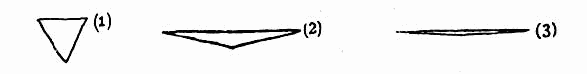 The same thing would happen if you were to treat in the same way a Triangle, or Square, or any other figure cut out of pasteboard. As soon as you look at it with your eye on the edge on the table, you will find that it ceases to appear to you a figure, and that it becomes in appearance a straight line. Take for example an equilateral Triangle—who represents with us a Tradesman of the respectable class. Fig. 1 represents the Tradesman as you would see him while you were bending over him from above; figs. 2 and 3 represent the Tradesman, as you would see him if your eye were close to the level, or all but on the level of the table; and if your eye were quite on the level of the table (and that is how we see him in Flatland) you would see nothing but a straight line.